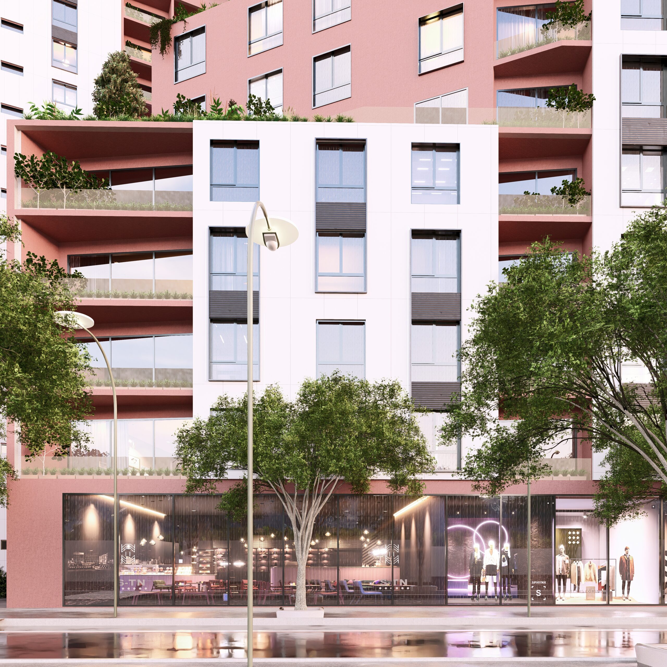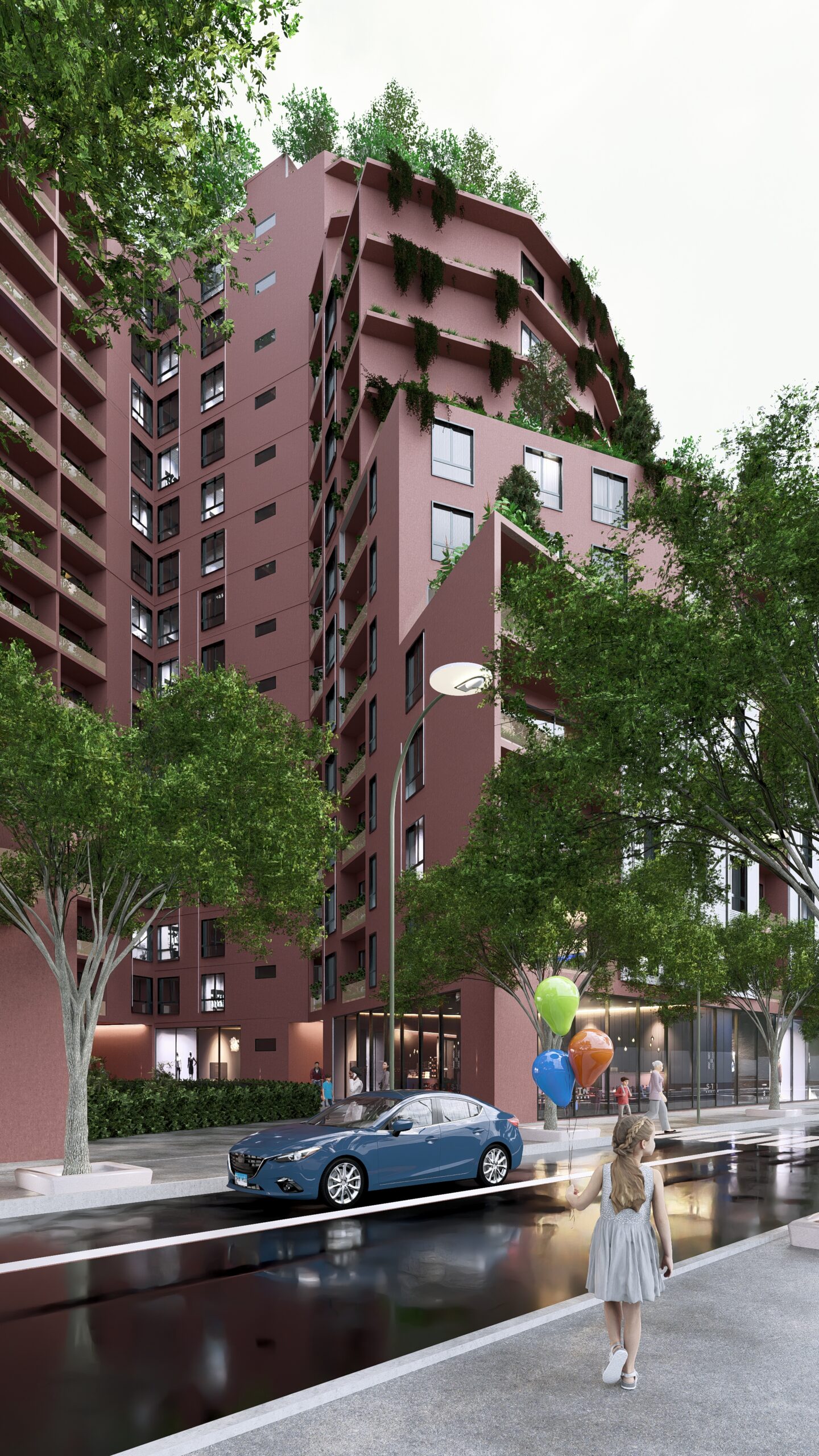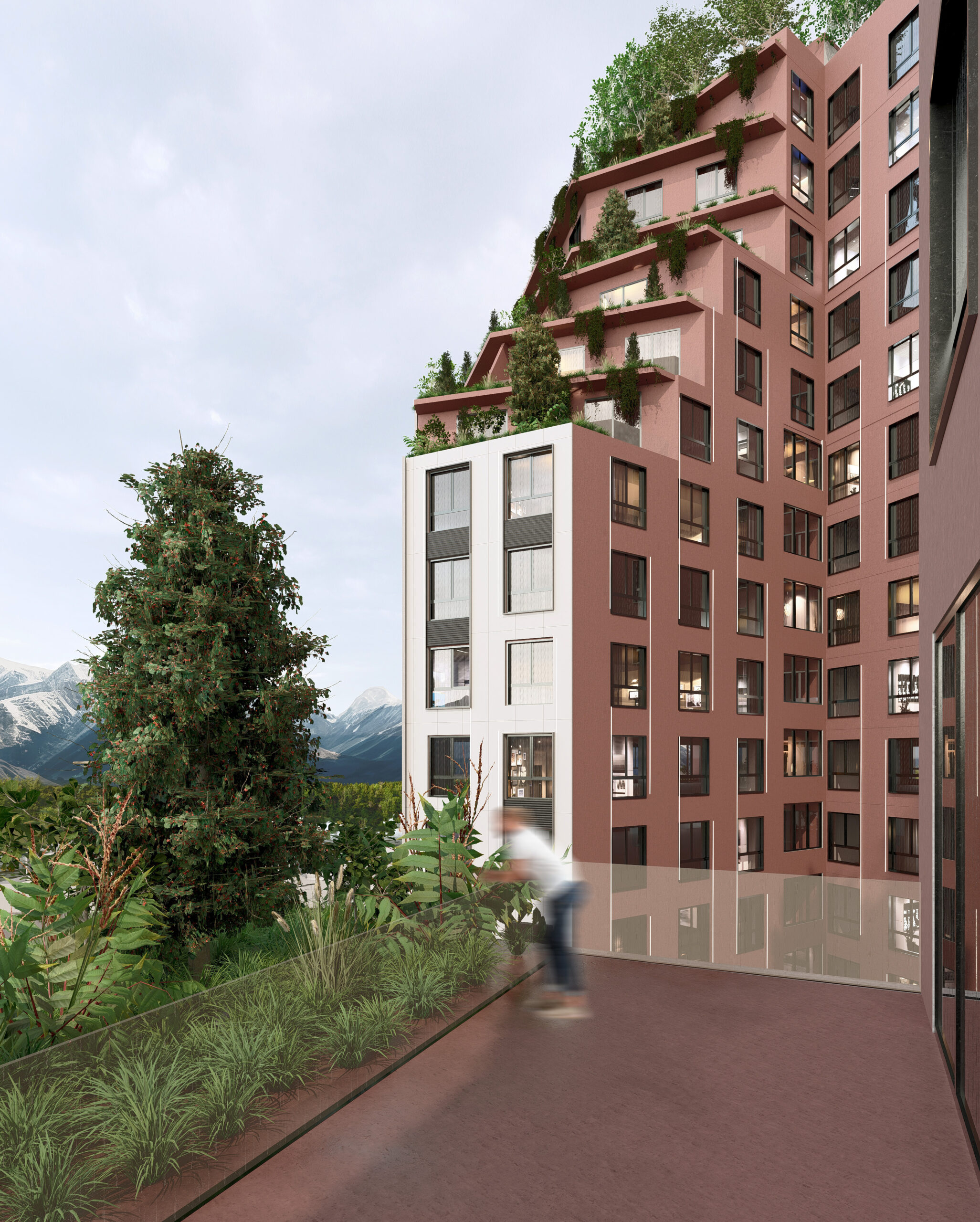 integrated greenery at every level. Green terraces and communal spaces foster continuous interaction between residents and the urban environment, while the orientation of the building and volumetric setbacks enhance daylight, ventilation, and contextual identity.