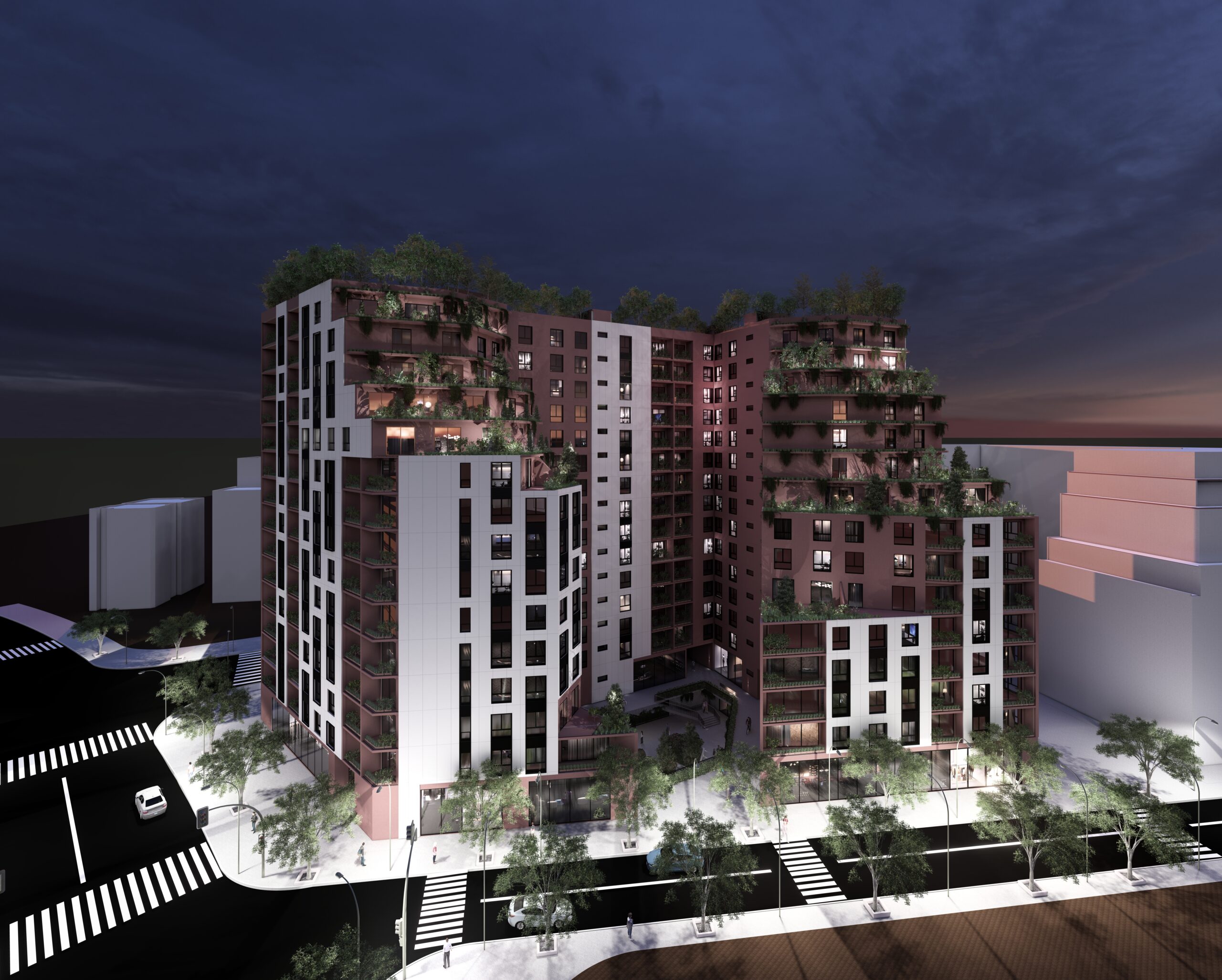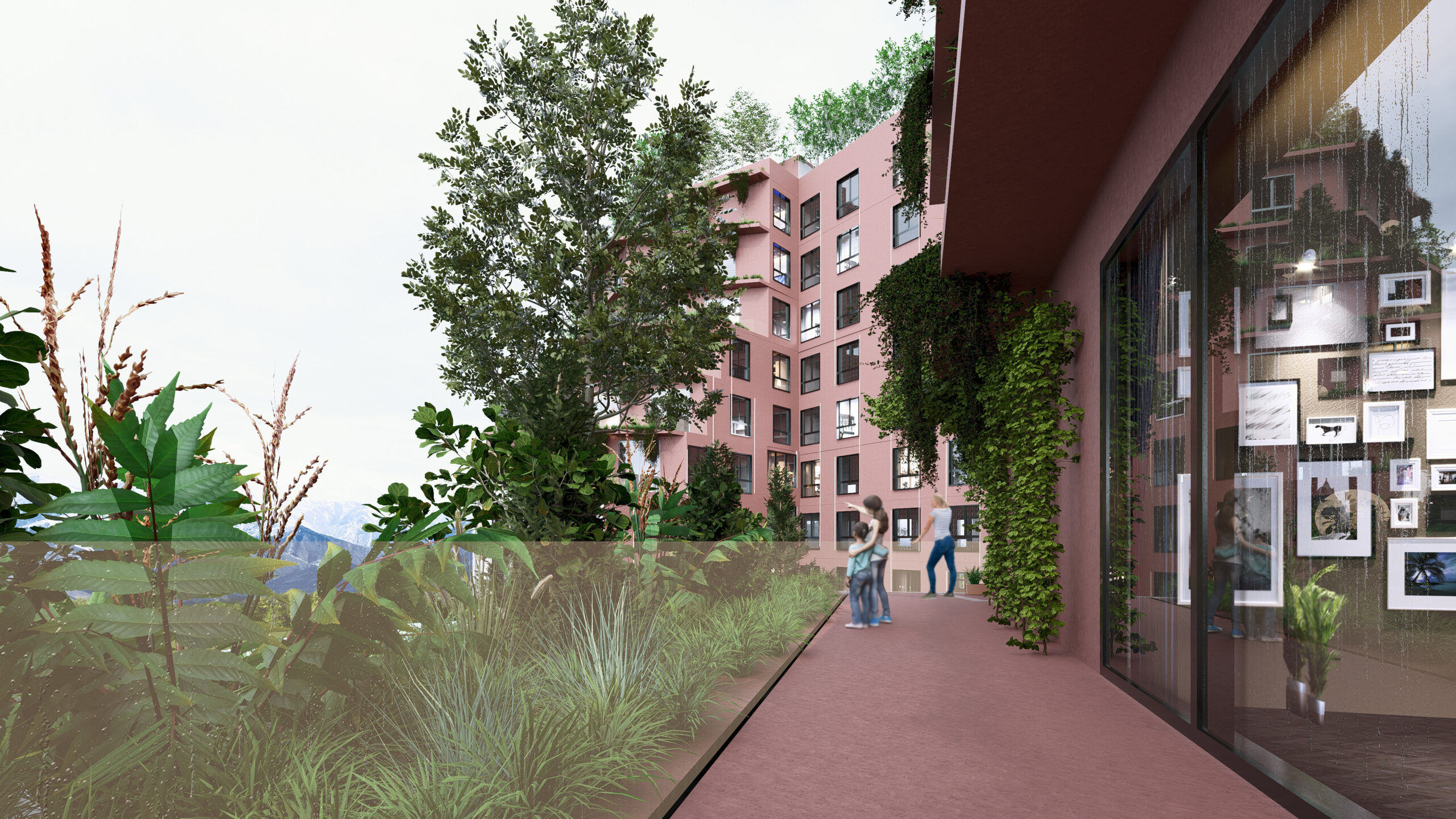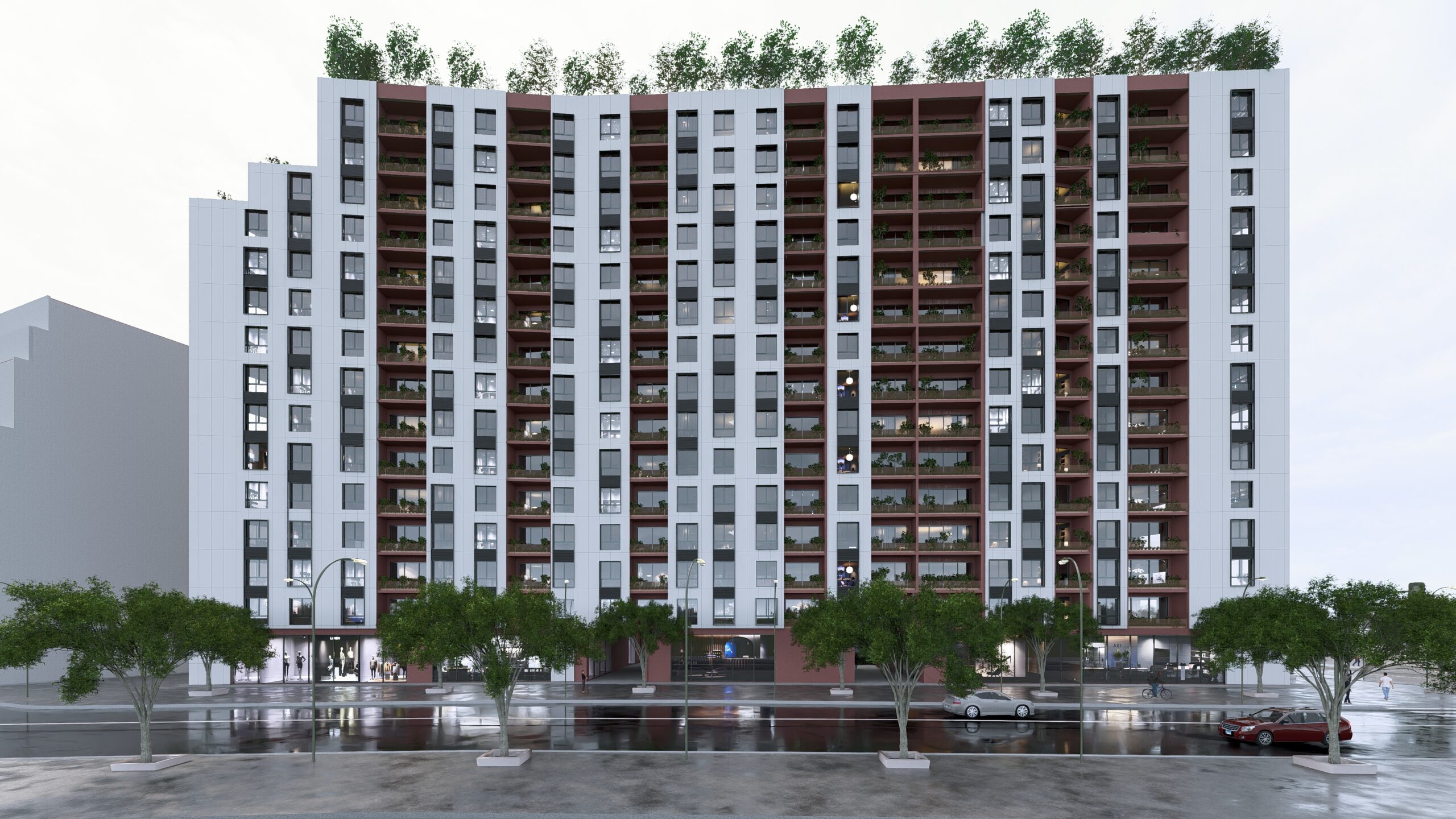 integrated greenery at every level. Green terraces and communal spaces foster continuous interaction between residents and the urban environment, while the orientation of the building and volumetric setbacks enhance daylight, ventilation, and contextual identity.
